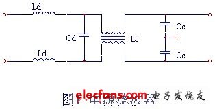 濾波是一種抑制傳導(dǎo)干擾的方法。例如,在電源輸入端接上濾波器,可以抑制來(lái)自電網(wǎng)的噪聲對(duì)電源本身的侵害,也可以抑制由開(kāi)關(guān)電源產(chǎn)生并向電網(wǎng)反饋的干擾。電源濾波器作為抑制電源線傳導(dǎo)干擾的重要單元,在設(shè)備或系統(tǒng)的電磁兼容設(shè)計(jì)中具有極其重要的作用。它不僅可以抑制傳輸線上的傳導(dǎo)干擾,同時(shí)對(duì)傳輸線上的輻射發(fā)射也具有顯著的抑制效果。在濾波電路中,選用穿心電容、三端電容、鐵氧體磁環(huán),能夠改善電路的濾波特性。進(jìn)行適當(dāng)?shù)脑O(shè)計(jì)或選擇合適的濾波器,并正確的安裝濾波器是抗干擾技術(shù)的重要組成部分。在交流電輸入端加裝的電源濾波器電路如圖1所示。圖中Ld、Cd用于抑制差模噪聲,一般取Ld為100 mH -700mH,Cd取1µF -10µF。Lc、Cc用于抑制共模噪聲,可根據(jù)實(shí)際情況加以調(diào)整。
