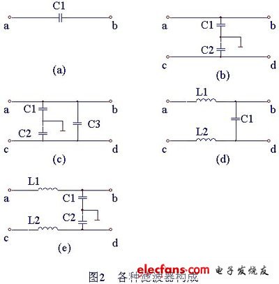 幾種濾波器的構(gòu)成如圖2所示。在圖2(a)中,阻抗Z=1/(ωC1),高頻區(qū)域用陶瓷電容、聚酯薄膜電容并聯(lián),其濾波效果更好。圖2(b)中,噪聲能通過(guò)電容旁路到地線上,這種濾波器連接時(shí)應(yīng)使接地阻抗盡量小。圖2(c)中,C1、C2對(duì)不對(duì)稱噪聲有良好的濾波效果,C3對(duì)對(duì)稱噪聲有良好的濾波效果,連接時(shí)應(yīng)使電容器的引線及接地線盡量短。圖2(d)為常用的噪聲濾波電路,L1、L2對(duì)噪聲呈現(xiàn)高阻抗,而C1則對(duì)噪聲呈現(xiàn)低阻抗。當(dāng)L1、L2采用共模電感結(jié)構(gòu)時(shí),對(duì)對(duì)稱和非對(duì)稱噪聲都有較好的濾波效果。圖2(e)適用于共模噪聲進(jìn)行濾波,應(yīng)注意的是其接地阻抗同樣應(yīng)盡量小。