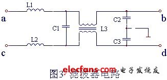 圖3是對(duì)共模噪聲和差模噪聲都有效的濾波器電路。其中,L1、L2、C1為抑制差模噪聲回路,L3、C2、C3構(gòu)成抑制共模噪聲回路。L1、L2的鐵心應(yīng)選擇不易磁飽和的材料及M-F特性優(yōu)良的鐵心材料。C1使用陶瓷電容或聚酯薄膜電容,應(yīng)有足夠的耐壓值,其容量一般取0.22µF -0.47µF。L3為共模電感,對(duì)共模噪聲具有較高的阻抗、較好的抑制效果。