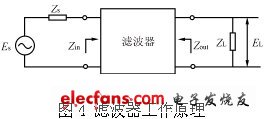 EMI濾波器是具有互異性的,即把負(fù)載接在電源端還是負(fù)載端均可。在實(shí)際應(yīng)用中,為達(dá)到有效抑制EMI信號(hào)的目的,必須根據(jù)濾波器兩端將要連接的EMI信號(hào)源阻抗和負(fù)載阻抗來(lái)選擇該濾波器的網(wǎng)絡(luò)結(jié)構(gòu)和參數(shù)。當(dāng)EMI濾波器兩端阻抗都處于失配狀態(tài)時(shí),即圖4中Zs≠Zin、ZL≠Zout時(shí),EMI信號(hào)會(huì)在其輸入和輸出端產(chǎn)生反射,增加對(duì)EMI信號(hào)的衰減。其信號(hào)的衰減A與反射Γ的關(guān)系為:A=–10Lg(1-|Γ|2)。