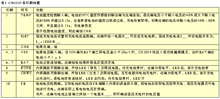 概述:CN3059是可以對(duì)單節(jié)磷酸鐵鋰可充電電池進(jìn)行恒流/恒壓充電的充電器電路。該器件內(nèi)部包括功率晶體管,應(yīng)用時(shí)不需要外部的電流檢測(cè)電阻和阻流二極管。CN3059只需
