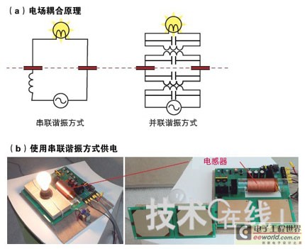竹中工務店正在開發(fā)利用電場耦合原理的供電系統(tǒng)(a)。使用串聯諧振的供電系統(tǒng)成功地以90%的效率向白熾燈泡供應了100W電力。