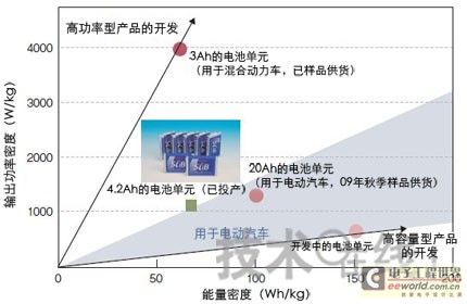 東芝開發(fā)了負極材料采用鈦酸鋰(LTO),安全性和壽命都很出色的鋰離子充電電池(圖5)。該公司2009年秋季開始樣品供貨可用于電動汽車、能量密度提高至100Wh/kg的電池單元。雖然細節(jié)未公布,但據悉正極材料從以前的鈷酸鋰改為可實現更高容量的材料。電池容量為20Ah。并且,該公司還在開發(fā)能量密度為150Wh/kg左右的電池單元,并力爭在2011年之前實用化。