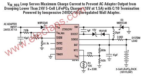 20 5芯LiFePO4電池充電器的LT3652HV演示電路-壁式適配器(19-32V至18V浮動(dòng),1.5A)