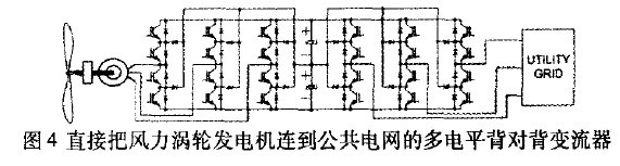??????風力渦輪發(fā)電機市場的趨勢是依據(jù)電壓和電流額定值,提高其標稱功率(幾兆瓦)。這使多電平變流器剛好適合這種現(xiàn)代大功率風力渦輪發(fā)電機的應(yīng)用。電壓額定值的提高,允許把風力渦輪發(fā)電機的變流器直接連接到風電場的配電網(wǎng)絡(luò),避免使用笨重的變壓器(見圖4)。