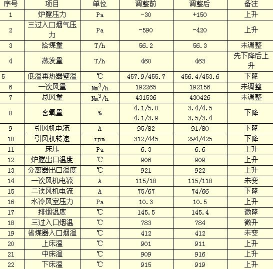說明:調(diào)整前,#3爐各參數(shù)穩(wěn)定運(yùn)行,將引風(fēng)機(jī)負(fù)壓自動(dòng)調(diào)整目標(biāo)值由-30 Pa改至+150 Pa總共上升180 Pa,其他參數(shù)未做任何調(diào)整,穩(wěn)定運(yùn)行30分鐘后,從參數(shù)對(duì)比表中發(fā)現(xiàn)上升的參數(shù)有:蒸發(fā)量、床壓、床溫、分離器出口溫度、爐膛出口溫度、水冷風(fēng)室壓力;下降的參數(shù)有:低溫再熱器壁溫、含氧量、引風(fēng)機(jī)電流、引風(fēng)機(jī)轉(zhuǎn)速、二次風(fēng)機(jī)電流、排煙溫度、三過入口煙溫。