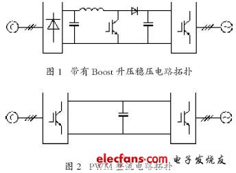 2 直驅永磁風力發(fā)電系統(tǒng)中,永磁發(fā)電機的輸出電壓的幅值和頻率隨風速的波動而變化,不可直接并網。其實現并網最簡單的辦法是加入直流環(huán)節(jié)。
