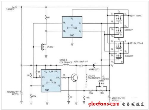 電路顯示用于電源奔騰處理器或升級CPU的LT1580雙穩(wěn)壓器,從5V輸入提供3A的3.3V輸出電壓