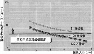 如圖5所示可知綜觀2000年~2003年照相手機的發(fā)展動向,由于取像模塊由31萬像素提高至百萬像素已經(jīng)成為業(yè)界普遍的共識,因此CMOS與CCD究竟何者會勝出,事實上取決于何者可達成100~130萬像素的目標,而能否達成100~130萬像素目標,則取決于何者可將像素尺寸微縮成3mm大小(圖6),尤其是照相手機用取像模塊對取像組件的高度有嚴格限制,由于光學上的限制因此取像組件外形尺寸不可超過1/4英寸,依此換算100~130萬像素取像組件的像素尺寸大約是3mm大小,為達成上述目標并非單純采用更微細工藝即可,因為像素尺寸越小受光量相對減少,為了維持影像品質(zhì)必需提高單位面積的感度,亦即像素尺寸微細化技巧成為各廠商的技術(shù)指針,一般認為100~130萬像素取像組件在2003年仍然是CCD占優(yōu)勢。