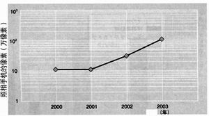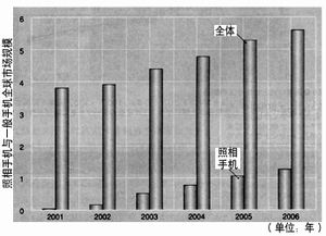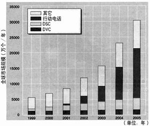 由于CMOS與CCD兩者的優(yōu)缺點隨著技術(shù)的進化,以往所謂的“要求高畫質(zhì)的高階產(chǎn)品使用CCD,低耗量電低價為訴求時使用CMOS”壁壘分明的格局,正受到行動電話的發(fā)展快速瓦解,形成二分天下相互競爭的局面,該趨勢可見圖3,2002年內(nèi)建取像鏡頭的行動電話已經(jīng)成為市場主流的統(tǒng)計結(jié)果獲得證實,一般認為2005年全球照相手機的比率可達20%,屆時市場規(guī)模將超過1億臺(圖4)。