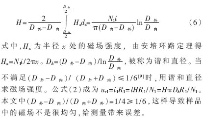 樣品的形狀、尺寸也會對動態(tài)磁參數(shù)有所影響[7],本文采用的是環(huán)行樣品。平均磁路l=2π(D內(nèi)+D外)/2,環(huán)中的平均磁場強(qiáng)度為: