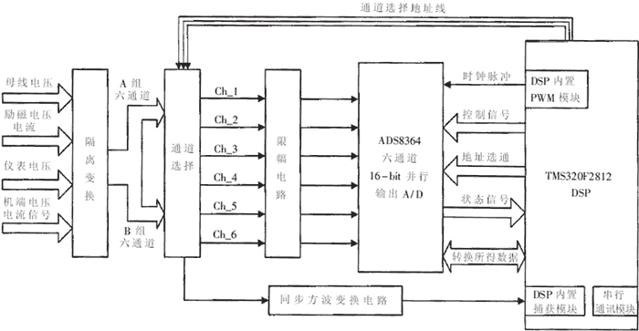 交流采樣模塊的硬件結(jié)構(gòu)如圖1所示,它包括隔離變換電路、通道選擇電路、限幅電路、同步方波變換電路、模/數(shù)轉(zhuǎn)換及控制電路等。