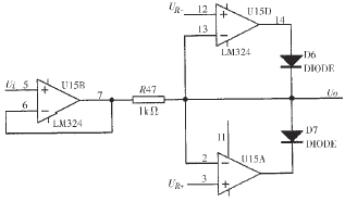 在模/數(shù)轉(zhuǎn)換中,如果A/D轉(zhuǎn)換器損壞,檢測和控制的功能就不能實現(xiàn)。出于安全考慮,在A/D轉(zhuǎn)換器前采用限幅電路,以保障系統(tǒng)的A/D轉(zhuǎn)換器安全。傳統(tǒng)的限幅器如齊納二極管限幅器、穩(wěn)壓管反向限幅器、橋式限幅器等,都是利用二極管的擊穿特性限幅。在擊穿區(qū)由于二極管內(nèi)阻并不為零,并有漏電流存在,所以穩(wěn)壓值并非恒定而且不易調(diào)節(jié)。本系統(tǒng)所設(shè)計的限幅電路如圖2所示,設(shè)定UR=±2.5V,由TL431提供高精度的基準(zhǔn)電平。