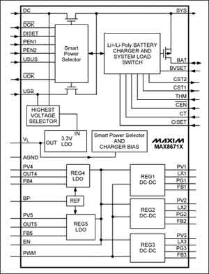 1872 MAX8671X電源管理IC (PMIC)為鋰電池充電并調(diào)節(jié)電源,適用于便攜式系統(tǒng)設(shè)計。要為鋰離子 (Li+) 鋰聚合物 (Li-Poly) 電池充電,此設(shè)備使用 USB 端口或外部交流到 DC