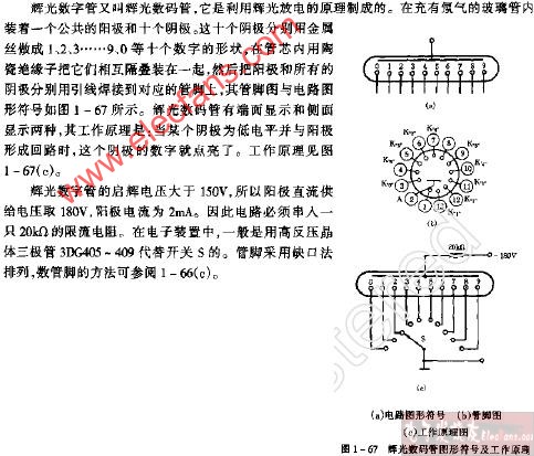 輝光管與電子管一樣,是由玻璃殼封裝,內(nèi)部為陽極金屬網(wǎng)和十個(gè)數(shù)字形狀的陰極組成。通電工作時(shí),通過高壓擊穿管內(nèi)的惰性氣體使陰極附近發(fā)光,這樣便可現(xiàn)實(shí)出數(shù)字形狀。