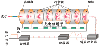 ??? 光子檢測(cè)裝置的核心是光電倍增管,其各電極之間均加有規(guī)定值較高的直流電壓。當(dāng)光子打到光陰極時(shí),由于光電效應(yīng)的作用,其表面可以產(chǎn)生能量微弱的游離電子,稱為光電子;該電子在直流高壓產(chǎn)生的電場(chǎng)作用下離開光陰極,同時(shí)被加速,再次打到打拿極上并產(chǎn)生出能量更大數(shù)量更多的光電子,就這樣經(jīng)過多個(gè)打拿極的反復(fù)放大,最后使陽極產(chǎn)生電脈沖信號(hào),該信號(hào)經(jīng)前置放大器放大,在經(jīng)比較器去除噪聲信號(hào),最后由分頻器換算出光子脈沖數(shù),如圖3所示。