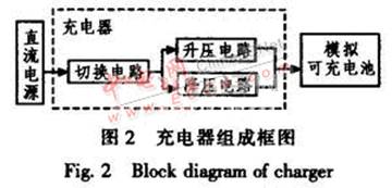 充電器硬件電路組成框圖如圖2所示。充電器由切換電路自動(dòng)判斷直流電源輸入電壓,選擇升壓或降壓電路,實(shí)現(xiàn)在工作電壓范圍內(nèi)自動(dòng)切換,模擬對(duì)充電電池的充電效果。
