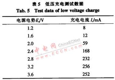 由表5可見(jiàn),隨著電源電勢(shì)的增加,充電電流也隨著增加,直到當(dāng)Es達(dá)到3.2 V時(shí),充電電流不再跟隨電源電勢(shì)變化。當(dāng)電源電勢(shì)為3.2 V時(shí),充電電流最大,為256 mA。導(dǎo)致充電電流突變的原因是升壓器件MAXl674在不同輸入電壓下轉(zhuǎn)換效率不同。由于MAXl674在超過(guò)3 V電壓下工作時(shí)轉(zhuǎn)換效率低,所以充電電流出現(xiàn)非線性的突變。