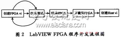使用LabVIEW FPGA模塊開發(fā)應(yīng)用程序的流程如圖2所示。首先創(chuàng)建FPGA vi,之后用FPGA設(shè)備仿真器在主控計算機上運行程序,反復(fù)地調(diào)試、修改,直至程序正確無誤。然后編譯FPGA vi,并把程序下載到FPGA上。FPGA部分的程序完成后,再根據(jù)需要在主控計算機上創(chuàng)建用戶界面程序Host vi,最終就完成整個系統(tǒng)的設(shè)計。