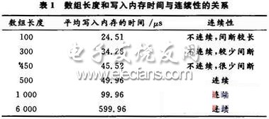 數(shù)據(jù)寫入內(nèi)存的時間與主控計算機運行速度以及數(shù)組的大小有關(guān)。表1所示的是數(shù)組長度和寫入內(nèi)存的時間與輸出數(shù)據(jù)連續(xù)性之間關(guān)系的實驗結(jié)果。其中,平均寫入內(nèi)存時間指的是同一個數(shù)組循環(huán)執(zhí)行寫入操作10萬次得到的平均結(jié)果。輸出FPGA的速率為10 MHz。