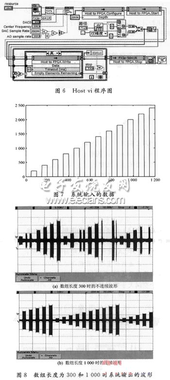 Host vi是系統(tǒng)程序的另一部分部分,它具有建立硬件對象(FPGA)、與硬件通信和圖形顯示等功能。主控計算機(jī)程序圖如圖6所示,首先要建立與之進(jìn)行通信的硬件對象,即FPGA;其次配置系統(tǒng)時鐘、輸出模式;再次創(chuàng)建FIFO,設(shè)置其在主控計算機(jī)部分的FIFO深度;然后從電子表格讀取數(shù)據(jù),并循環(huán)查詢FIFO剩余空間的大小,當(dāng)剩余空間大于數(shù)組長度時,數(shù)據(jù)寫入FIFO當(dāng)沒有足夠的空間時,數(shù)據(jù)保留到下一個循環(huán),滿足條件后再寫入FIFO;最后關(guān)閉FIFO應(yīng)用,處理錯誤。