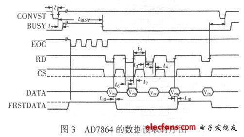 (1)低頻部分。本部分主要采集的是電源信號和電平變換信號,采用AD7864 作為采集芯片。AD7864 具有片內(nèi)時鐘、讀寫允許邏輯、多種通道選擇方式以及內(nèi)部精確的2。5 V 參考電壓,這使得其與高速處理器的接口變得非常簡單。AD7864 轉(zhuǎn)換后的數(shù)據(jù)讀取采用轉(zhuǎn)換后讀取數(shù)據(jù)的方式,其讀取時序見圖3。
