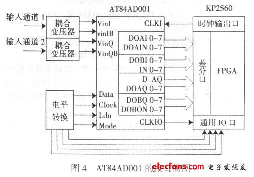?。?)高頻部分。主要是對脈沖數(shù)字信號的采集,包括頻率測量和信號采集兩個部分。脈沖數(shù)字信號的頻率是確定電路板是否工作正常的重要參數(shù),因此確定脈沖信號的頻率是否正常是本測試系統(tǒng)的必要工作。本系統(tǒng)是將待測信號接入FPGA 與53MHz 的高精度時鐘同時開始計數(shù),一段時間后,通過兩個信號的計數(shù)值來計算脈沖信號頻率的。信號采集是以AT84AD331 作為采集芯片。AT84AD331 與EP2S63 的連接見圖4。