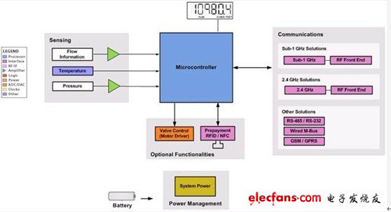 在現(xiàn)今的燃?xì)獗碇?,傳感部分(圖 4)可報(bào)告流量吞吐量(常通過(guò)一個(gè)舌簧開(kāi)關(guān))以及確切的燃?xì)鈮毫蜏囟葴y(cè)量值。MCU 主模塊則處理傳感器數(shù)據(jù),并將燃?xì)饬髁空{(diào)節(jié)成標(biāo)準(zhǔn)化的數(shù)量以供客戶計(jì)費(fèi)之需。