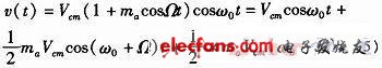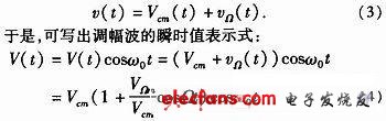 調(diào)制的作用是使載波的振幅Vcm隨調(diào)制信號(hào)vΩ而相應(yīng)的變化,從而得到調(diào)幅波。調(diào)幅波振幅變化的軌跡即波峰點(diǎn)的連線稱為包絡(luò)線。調(diào)幅波包絡(luò)線的瞬時(shí)值為:
