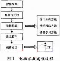 對(duì)電磁兼容性能參數(shù)建模的過(guò)程是通過(guò)電磁兼容測(cè)量取得原始數(shù)據(jù),進(jìn)行數(shù)據(jù)的預(yù)處理,對(duì)數(shù)據(jù)的類型和結(jié)構(gòu)進(jìn)行整理,對(duì)歷史數(shù)據(jù)和實(shí)測(cè)數(shù)據(jù)進(jìn)行數(shù)據(jù)挖掘完成數(shù)據(jù)規(guī)律分析,描述出設(shè)備參數(shù)的變化曲線,再經(jīng)過(guò)多次數(shù)據(jù)的修正,完成參數(shù)變化規(guī)律的數(shù)據(jù)模型。其中最常見的數(shù)據(jù)挖掘方法是統(tǒng)計(jì)分析方法、神經(jīng)網(wǎng)絡(luò)方法和機(jī)器學(xué)習(xí)中研究的方法。具體建模過(guò)程如圖1所示。