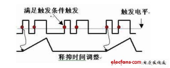 示波器的觸發(fā)部分的作用就是穩(wěn)定的顯示波形,觸發(fā)釋抑也是為了穩(wěn)定顯示波形而設(shè)置的功 能。主要針對(duì)大周期重復(fù)而在大周期內(nèi)有很多滿足觸發(fā)條件的不重復(fù)的波形點(diǎn)而專門設(shè)置 的。比如圖中所示,圖中紅色的點(diǎn)都可以滿足觸發(fā)條件,如果不用釋抑功能,觸發(fā)點(diǎn)將不固 定,造成顯示不穩(wěn)定,使用觸發(fā)釋抑后,每次都在同一個(gè)點(diǎn)觸發(fā),因此可以穩(wěn)定顯示。 此外,對(duì)于調(diào)幅信號(hào)等也一樣要使用觸發(fā)釋抑。