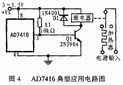 這些默認(rèn)值可使該溫度傳感器在不連接串行總線時(shí)用作自動(dòng)調(diào)溫器,圖4所示就是AD7416作為自動(dòng)調(diào)溫器的典型應(yīng)用電路原理圖。當(dāng)被測(cè)量的環(huán)境溫度低于 THYST時(shí),OTI輸出高電平,Q1導(dǎo)通,繼電器吸合,加熱器開始工作;當(dāng)被測(cè)量的環(huán)境溫度高于TOTI時(shí),OTI輸出低電平,將Q1的基極電位拉低以使其截止,繼電器釋放,加熱器停止工作。