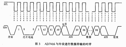 AD7416采用I2C串行總線和數(shù)據(jù)傳輸協(xié)議來實(shí)現(xiàn)同外設(shè)的數(shù)據(jù)傳輸。在數(shù)據(jù)傳輸過程中AD7416作為從器件通過數(shù)據(jù)輸入/輸出線SDA以及時(shí)鐘信號(hào)線SCL與總線相連。其傳輸時(shí)序如圖3所示。當(dāng)SCL保持高電平時(shí),SDA從高電平到低電平的跳變?yōu)閿?shù)據(jù)傳輸?shù)拈_始信號(hào),隨后傳送AD7416的地址信息的讀/寫控制位。其地址信息的格式為:100A2A1A0R/W。