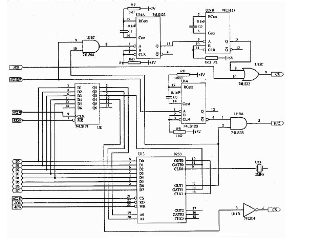具體的實現(xiàn)電路如圖2 所示。首先將8253 定時通道0 與通道1 串聯(lián)起來定時,通道0 的時鐘輸入CLK0 的頻率是2MHz,工作在方式3(方波比率發(fā)生器)下,通道0 的輸出OUT0 為頻率1MHz 的方波,作為通道1 的輸入時鐘CLK1。通道1 設(shè)定為方式2,即通道1 的輸出OUT1 從輸出開始一直維持高電平,計數(shù)回零后,輸出為低電平并自動重新裝入原計數(shù)值,低電平維持一個時鐘周期后,輸出恢復(fù)高電平并重新作減法計數(shù)。輸出OUT1 分為兩路信號,一路通過與門U18A 輸出,作為AD1674 的R/C 控制信號;另一路經(jīng)過單穩(wěn)觸發(fā)器U24 延時和調(diào)節(jié)定時寬度后,再通過或門U15C 輸出作為AD1674 的CE控制信號。當OUT1 輸出寬度為1μs 的低電平脈沖時,一方面使控制信號R/C 的轉(zhuǎn)換有效,同時經(jīng)延時和調(diào)節(jié)定時寬度后,使A/D 的使能控制CE 開始啟動A/D 轉(zhuǎn)換。因此在裝入計數(shù)初值以后,只要設(shè)置6位鎖存器U8 的控制字,就可利用8253 定時器啟動A/D。
