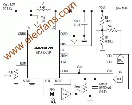 MAX15031 80V、300mW boost轉換器及電流監(jiān)測器,適用于APD偏置