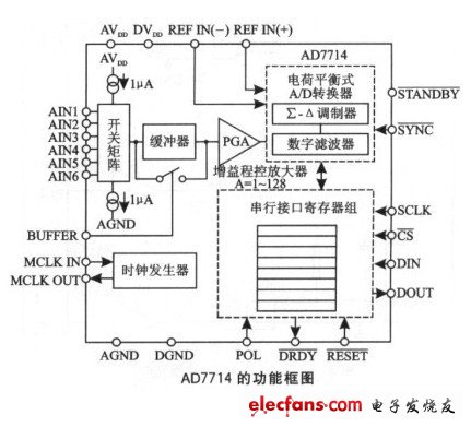 ??? AD7714是一個(gè)完整的用于低頻測(cè)量應(yīng)用場合的模擬前端,用于直接從傳感器接收小信號(hào)并輸出串行數(shù)字量。它使用Σ-Δ轉(zhuǎn)換技術(shù)實(shí)現(xiàn)高達(dá)24位精度的代碼而不會(huì)丟失。輸入信號(hào)加至位于模擬調(diào)制器前端的專用可編程增益放大器。調(diào)制器的輸出經(jīng)片內(nèi)數(shù)字濾波器進(jìn)行處理。數(shù)字濾波器的第一次陷波通過片內(nèi)控制寄存器來編程,此寄存器可以調(diào)節(jié)濾波的截止時(shí)間和建立時(shí)間。AD7714有3個(gè)差分模擬輸入(也可以是5個(gè)偽差分模擬輸入)和一個(gè)差分基準(zhǔn)輸入。單電源工作(+3V或+5V)。因此,AD7714能夠?yàn)楹卸噙_(dá)5個(gè)通道的系統(tǒng)進(jìn)行所有的信號(hào)調(diào)節(jié)和轉(zhuǎn)換。AD7714很適合于靈敏的基于微控制器或DSP的系統(tǒng),它的串行接口可進(jìn)行3線操作,通過串行端口可用軟件設(shè)置增益、信號(hào)極性和通道選擇。AD7714具有自校準(zhǔn)、系統(tǒng)和背景校準(zhǔn)選擇,也允許用戶讀寫片內(nèi)校準(zhǔn)寄存器。CMOS結(jié)構(gòu)保證了很低的功耗,省電模式使待機(jī)功耗減至15μW(典型值)。