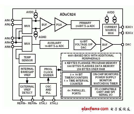 ??? ADuC 824是MicroConvertersTM系列的最新成員,它是AD公司率先推出的帶閃爍電可擦可編程存儲(chǔ)器〔Flash/EEPROM)的 Σ-Δ轉(zhuǎn)換器。它的獨(dú)特之處在于將高性能數(shù)據(jù)轉(zhuǎn)換器,帶程序和數(shù)據(jù)閃爍存儲(chǔ)器及8位微控制器集中在一起。當(dāng)您為滿足工業(yè)、儀器儀表和智能傳感器接口應(yīng)用要求選擇高精度數(shù)據(jù)轉(zhuǎn)換時(shí),ADuC824是一種完整的高精度數(shù)據(jù)采集片上系統(tǒng)。