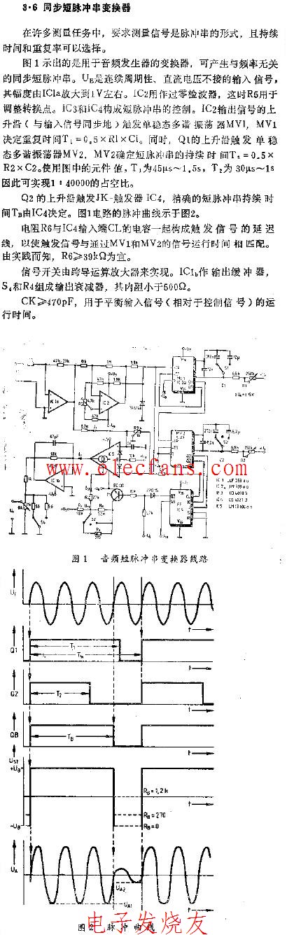 該電路利用兩個(gè)555芯片,可以組成音頻短脈沖串電路。第二個(gè)芯片構(gòu)成音頻振蕩器。第一個(gè)芯片構(gòu)成慢速無態(tài)多諧振蕩器,控制音頻振蕩有無,決定音頻脈沖串的節(jié)拍。
