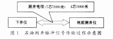 石油測井中的脈沖信號(hào)要經(jīng)過幾千米的多芯或單芯鎧裝電纜才能傳輸?shù)降孛鏈y井儀進(jìn)行處理,這一過程如圖1所示。