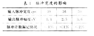 由表4可見,隨著脈沖寬度的增加,帶電纜以后輸出脈沖幅度明顯增大,但也存在一定的副作用,即脈沖計(jì)數(shù)漏記有所增加,大量試驗(yàn)表明,當(dāng)輸入脈沖寬度控制在30us~40us之間時(shí),既能使輸出脈沖幅度明顯增大,又能將脈沖計(jì)數(shù)漏記控制在可接受的范圍之內(nèi)。