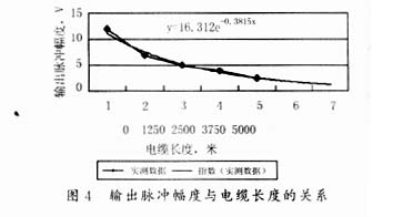 驅(qū)動(dòng)電路的驅(qū)動(dòng)能力與電纜長度的關(guān)系如圖4所示,這種關(guān)系可以用擬合的數(shù)學(xué)關(guān)系式來表達(dá),并用外推的方法推斷驅(qū)動(dòng)電路的極限驅(qū)動(dòng)能力,即一個(gè)驅(qū)動(dòng)電路達(dá)到地面測井儀脈沖信號(hào)檢測能力,所能配接的最長電纜。