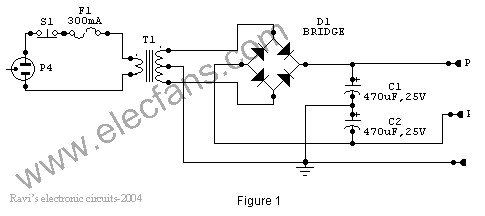 This is a conventional type of power supply as shown in Figure 1. The power is applied through the step-down transformer (230/12-0-12V/500mA). The DC proportional to the charging input voltage is obtained from bridge rectifier. Two electrolytics are there to bypass any spikes present. Bridge is capable of handling currents up to 1 Amp.