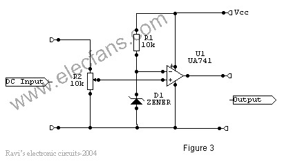 In this ckt the zener diode D1 and it’s associated resistor R1 are connected to the non-inverting terminal (+ve) of 741 to give the suitable reference voltage. The DC voltage from the sensor is given to the inverting (-ve) terminal through pre-set R2.This is used to set the input level.