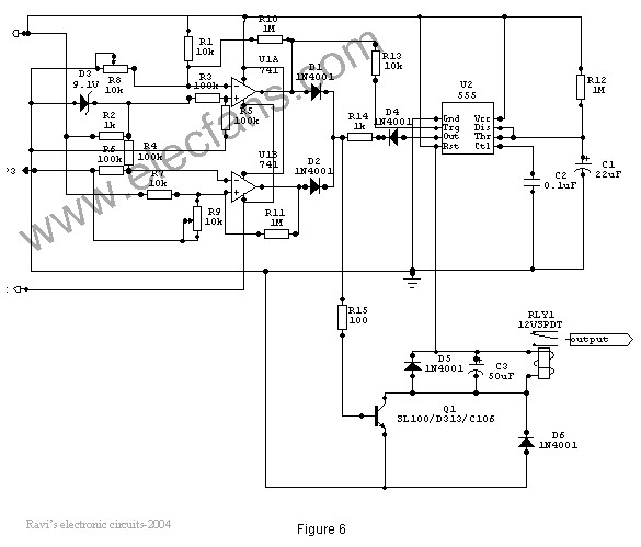When the input voltage is below or above the limits set by the pre-sets R8 or R9, the output of the Op-Amps goes either low or high and diodes D1 or D2 would be forward biased depending on the situation. Transistor Q1 switches ON and the flow of current from collector to emitter energizes the relay and the output is cutoff.