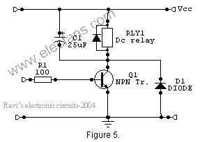 A better method is to connect two diodes (as shown in the figure 5) that stop the relay – transistor junction swinging more than 600mV above the positive rail or below the zero-volt rail. During normal operation the diodes are reverse biased and have no effect on the performance of circuit. But when back emf is induced, the diodes conduct heavily and absorb all transient voltages. However, I have employed the both methods.