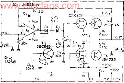 工作過程與“6-6”節(jié)電路基本相同。下面介紹一下本電路的設(shè)計要點:OP放大器A1是高速OP放大器,因起緩沖作用,所以選用了穩(wěn)定性好的LM6361N。CH的容量很小,只有100PF,可以進(jìn)行失調(diào)調(diào)節(jié),輸入為0V,用VR1調(diào)整輸出以確定置偏。TT1的柵極、CH的外圍是高阻抗,組裝時應(yīng)予注意。
