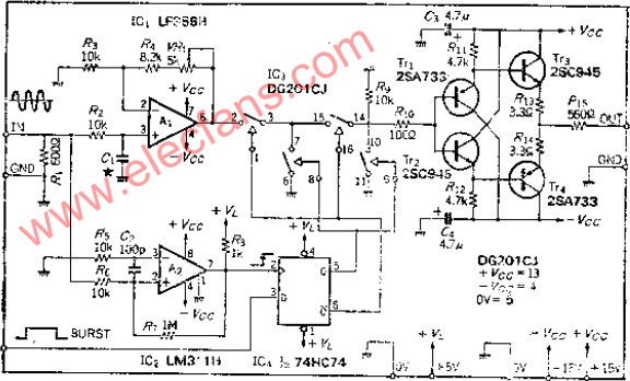 比較器A2為了檢測(cè)輸入信號(hào)的正零交點(diǎn),并從SIN0度開(kāi)始輸出短脈沖串波,用IC4數(shù)據(jù)鎖存器使之同步。短脈沖串的輸出時(shí)間由外部脈沖發(fā)生器提供,但這樣與正弦波振蕩器的相位不同步,所以利用輸入的短的控制脈沖達(dá)到“H”電平后,在零交點(diǎn)的上升連使雙穩(wěn)態(tài)多諧振蕩器的Q=“H”,接通模擬開(kāi)關(guān),經(jīng)輸出緩沖器輸出。