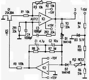 工作原理該電路用很少的元件便搭成了一個(gè)閉環(huán)電路,實(shí)現(xiàn)了AGC自動(dòng)穩(wěn)幅功能。電路的振蕩部分由IC1組成維恩電橋,其振蕩頻率由選頻網(wǎng)絡(luò)C3、C4、ZR1、ZR2決定。本電路的輸出頻率在5kHz左右,其頻率變化要受溫漂影響。電路的起振條件是IC2的放大倍數(shù)大于2,如累條件不成立,電路就會(huì)停振。IC2為積分放大器,和基準(zhǔn)源D3、檢波二極管D1、JFET管一起構(gòu)成AGC閉環(huán)電路。
