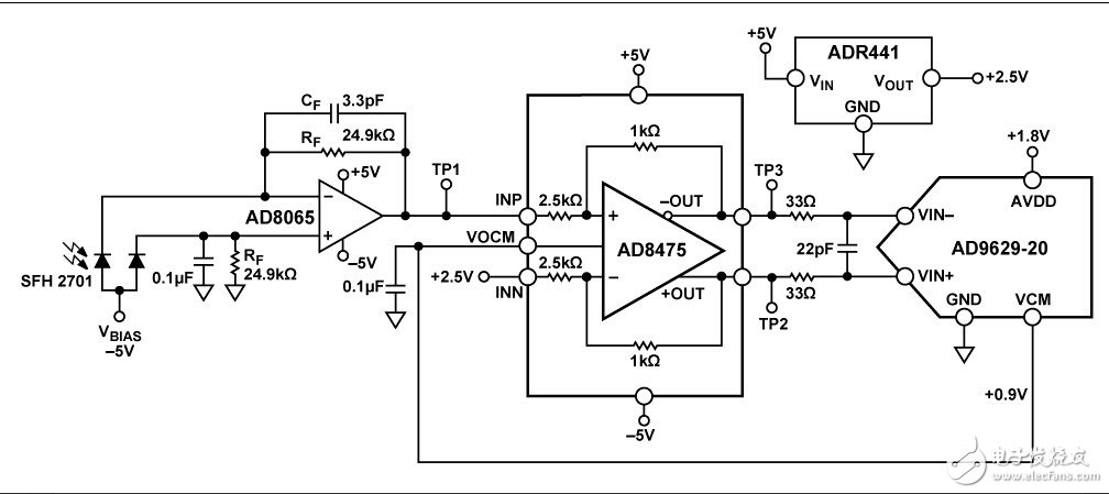 圖1所示電路是一個(gè)高速光電二極管信號(hào)調(diào)理電路,具有暗電流補(bǔ)償功能。系統(tǒng)轉(zhuǎn)換來(lái)自高速硅PIN光電二極管的電流,并驅(qū)動(dòng)20 MSPS模數(shù)轉(zhuǎn)換器(ADC)的輸入。該器件組合可提供400 nm至1050 nm的頻譜敏感度和49 nA的光電流敏感度、91 dB的動(dòng)態(tài)范圍以及2 MHz的帶寬。信號(hào)調(diào)理電路采用±5 V電源供電,功耗僅為40 mA,適合便攜式高速、高分辨率光強(qiáng)度應(yīng)用,如脈搏血氧儀。