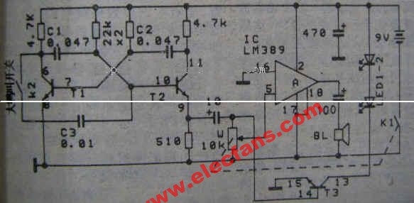 本電路采用了NS公司的低電壓音頻功放電路LM389,圖中管腳號即為集成塊管腳號。